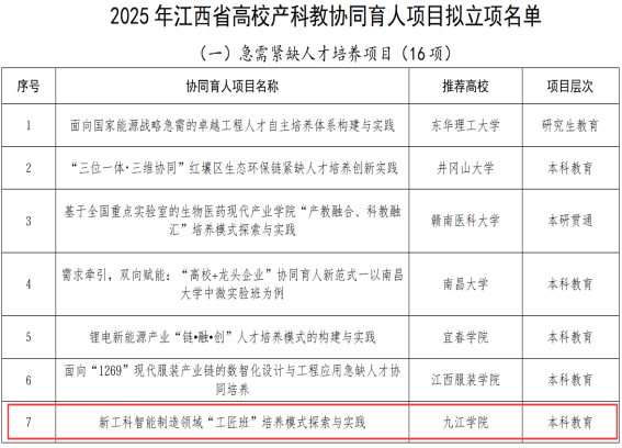 近日,江西省教育厅公示2025 年高校产科教协同育人专项项目立项名单,我院基于省级智能制造重点产业学院“新工科智能制造领域‘工匠班’培养模式探索与实践” 成功入选“急需紧缺人才培养项目”,成为全省16 个此类立项项目之一。此次立项标志着智能制造产业学院在破解产教脱节难题、服务江西现代产业体系建设方面迈出关键步伐。